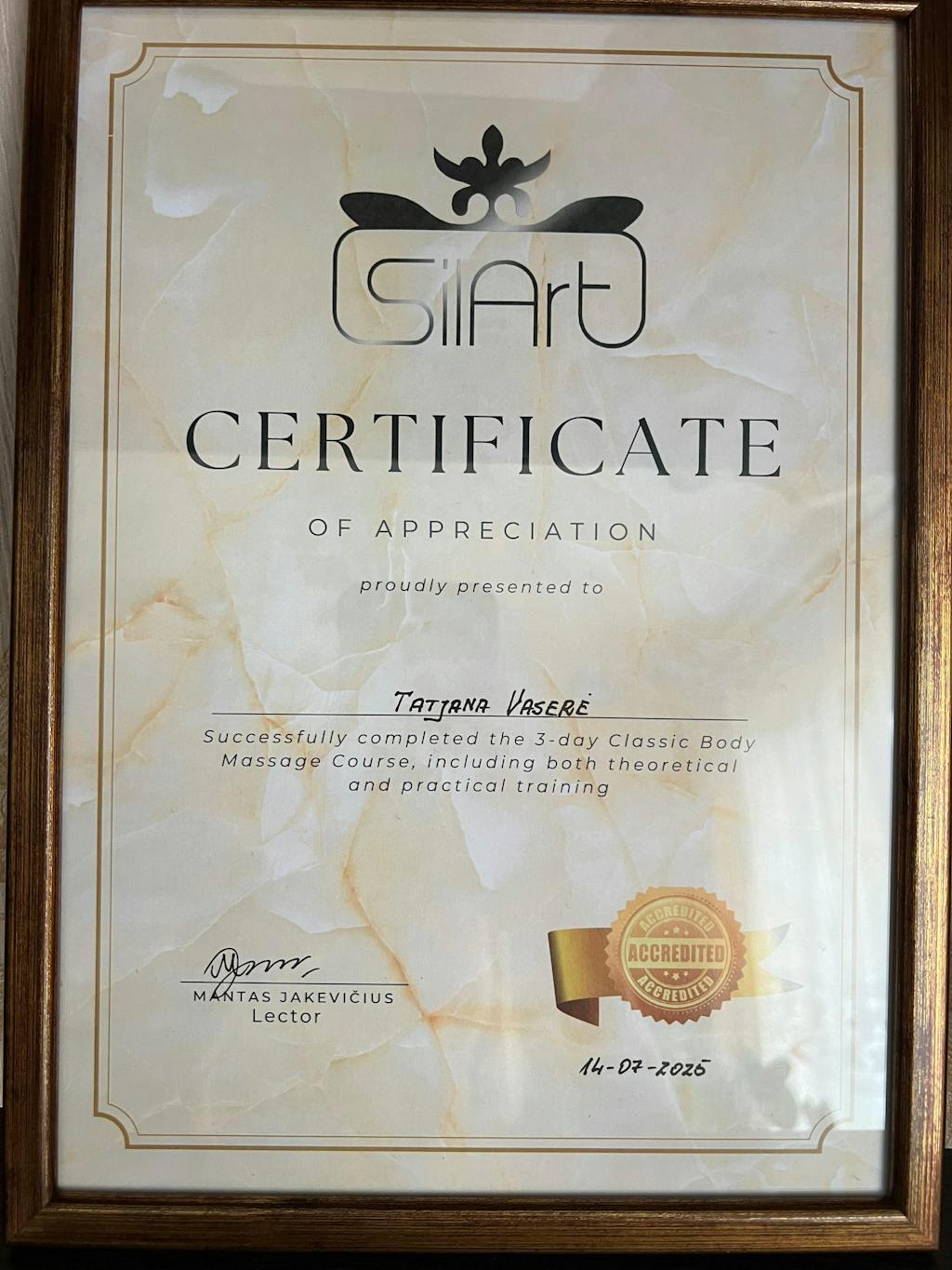 Labai džiaugiuosi pasirinkusi šį 3 dienų masažo kursą! Mokytoja Jurgita – nuostabus, šiltas ir malonus žmogus, kuris ne tik profesionaliai perteikė daug vertingų žinių, bet ir sukūrė jaukią, draugišką atmosferą. 3 dienos praėjo akimirksniu, nes kiekviena minutė buvo kupina šypsenų, geros energijos ir įkvėpimo. Ačiū už šiltą priėmimą, nuoširdumą ir žinias, kurios tikrai liks ilgam!❤️